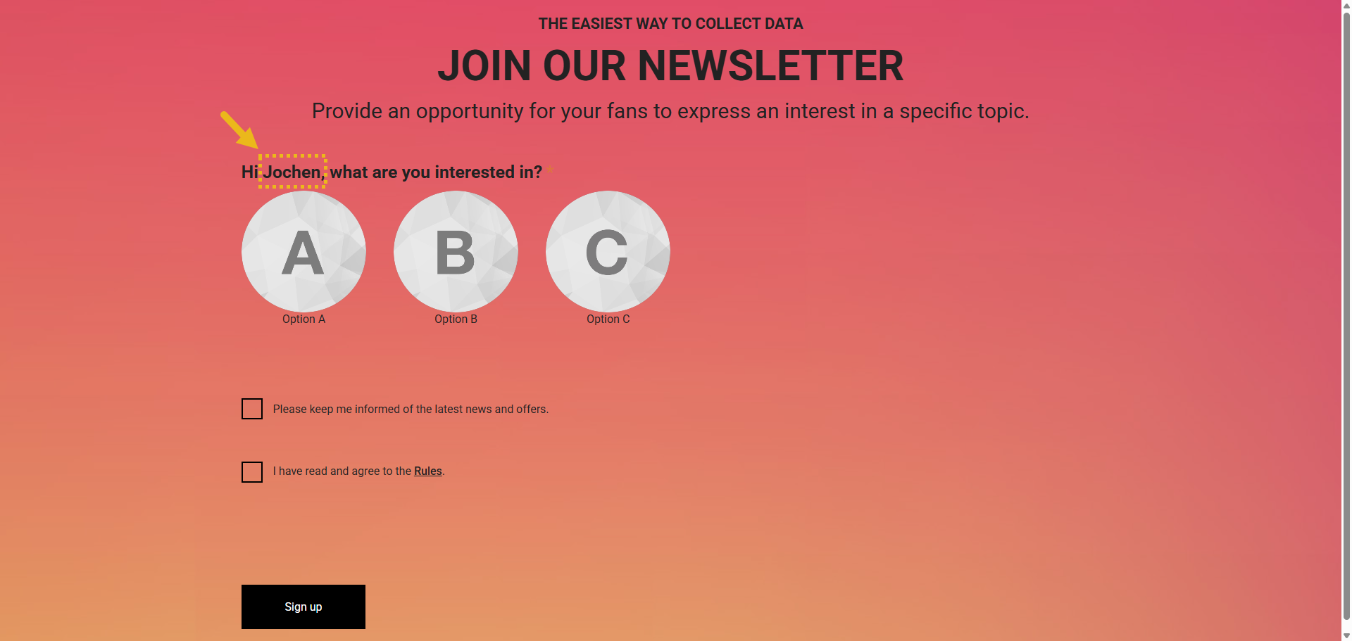 1. Then click the Single Choice module and update the default Label from What are you interested in? to Hi Name, what are you interested in?. To enter the Name personalization field (also called a token), type an @ sign. The Name field will automatically pop up for selection.