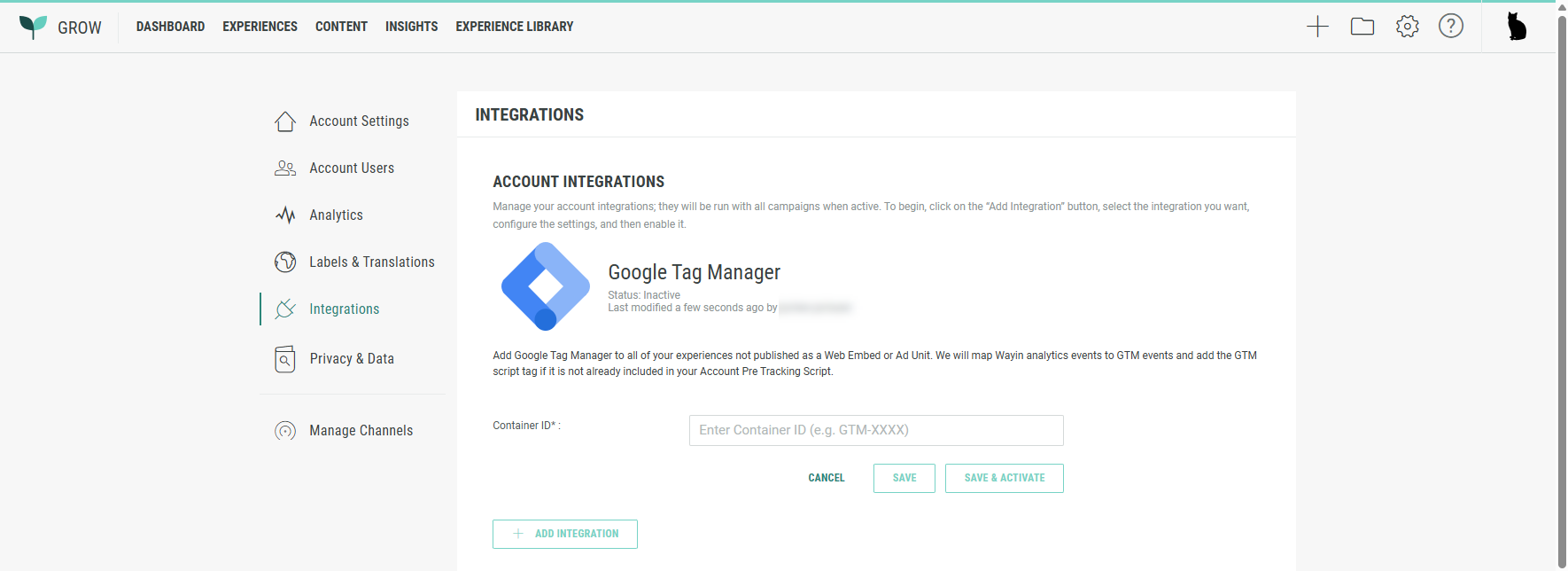To add a Google Tag Manager integration in Grow, execute the following steps: