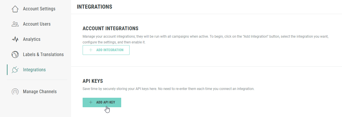 - On the Integrations page, in the API Keys section, click on + Add API Key.