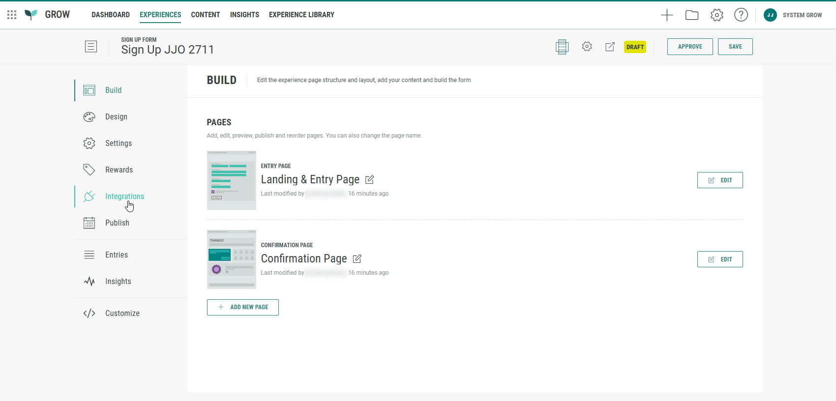 - Click on the Build tab in the left-hand navigation, and edit the Landing & Entry page.