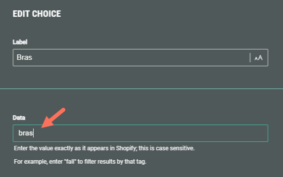 - setting a data value for each option that can be selected as an answer to the quiz question, that exactly matches a value within the Shopify category.