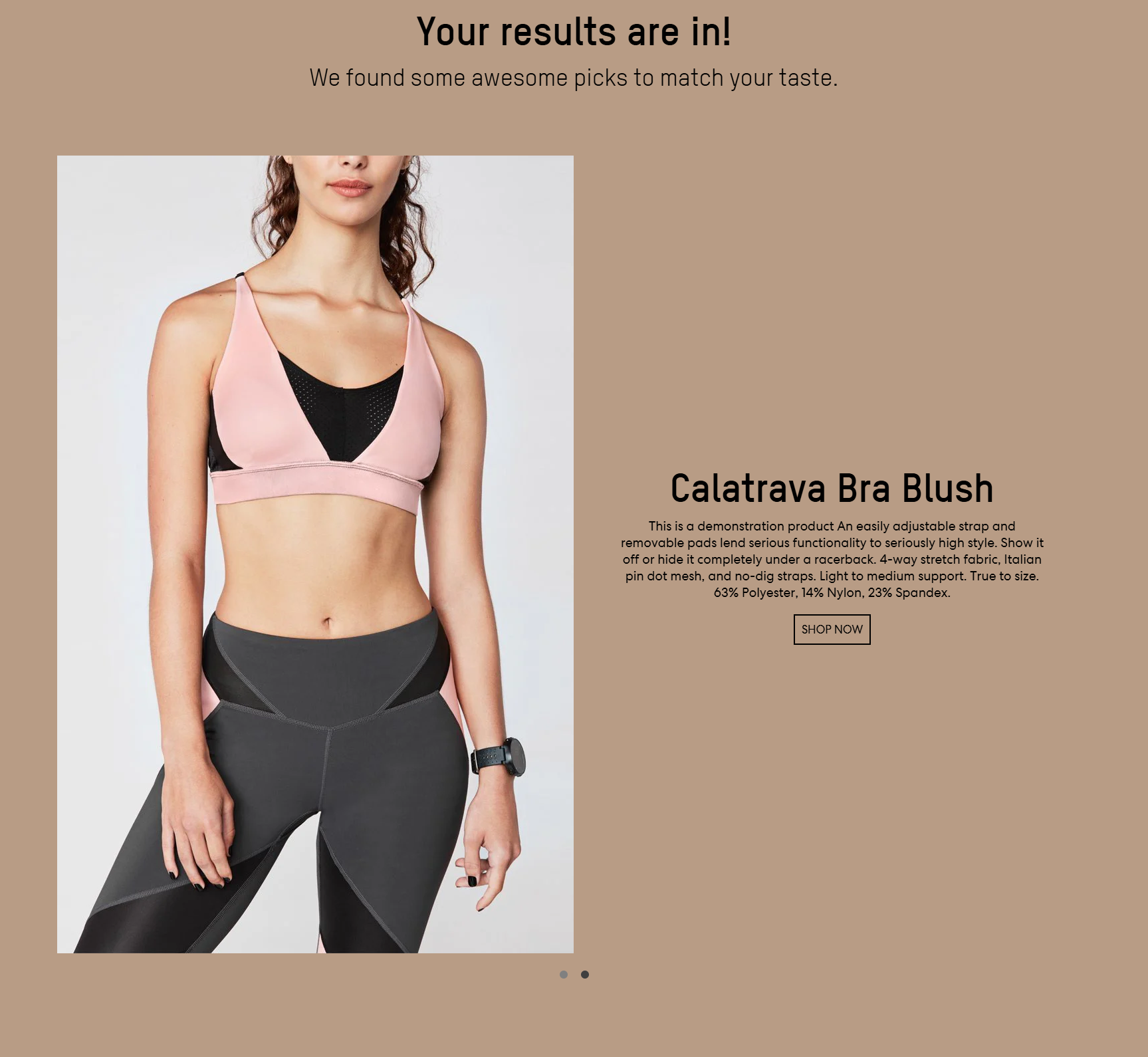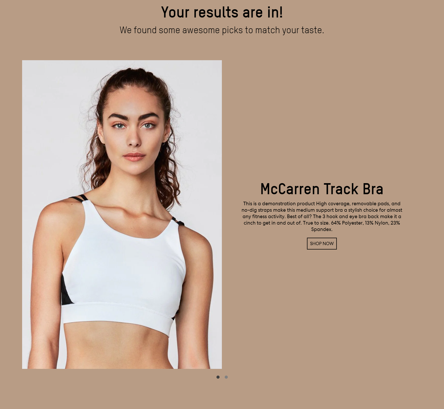 - When a participant runs through the Experience and answers the quiz questions, the Quiz Results on the Confirmation Page show tailored product recommendations from the linked Shopify store, based on the participants' answers.