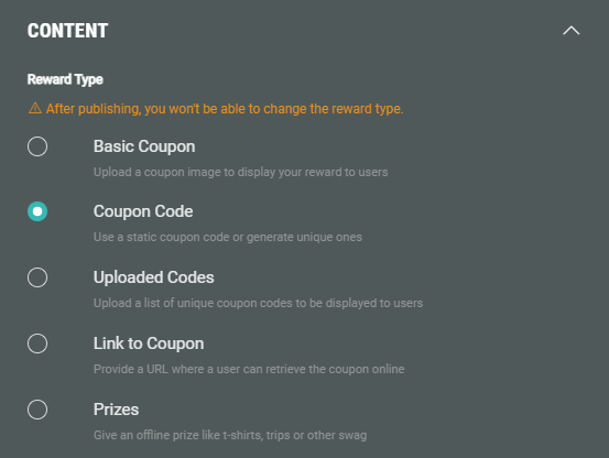 - In the Content section, you define the Reward Type.