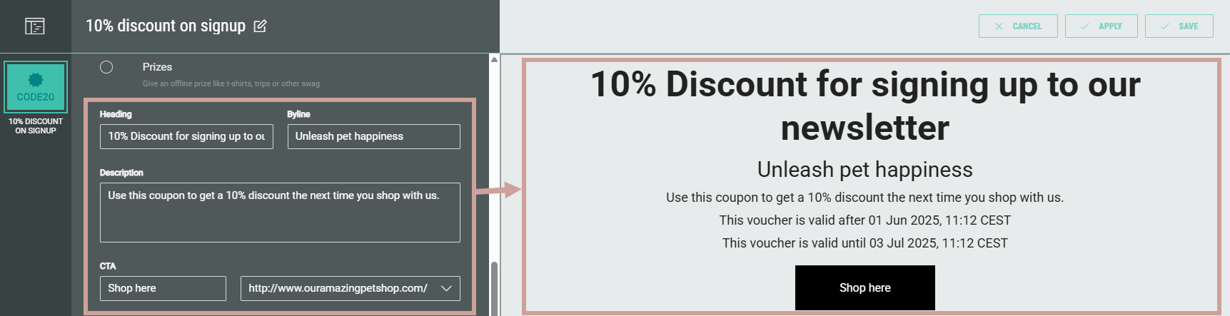 Other settings to be defined in Content are: Valid from and Valid to dates, and for example a coupon code when that's the selected type.