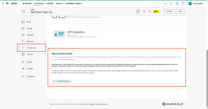 Email Notifications can now be configured from the Integrations tab in the left-hand side navigation of Experiences.