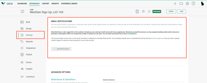 Email Notifications could be configured from the Settings tab in the left-hand side navigation of Experiences.