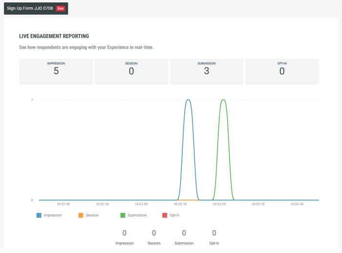 Real-time insights now show an animated live chart, that continuously displays the current time and events (impressions, sessions, submissions, opt-ins) taking place at that moment.