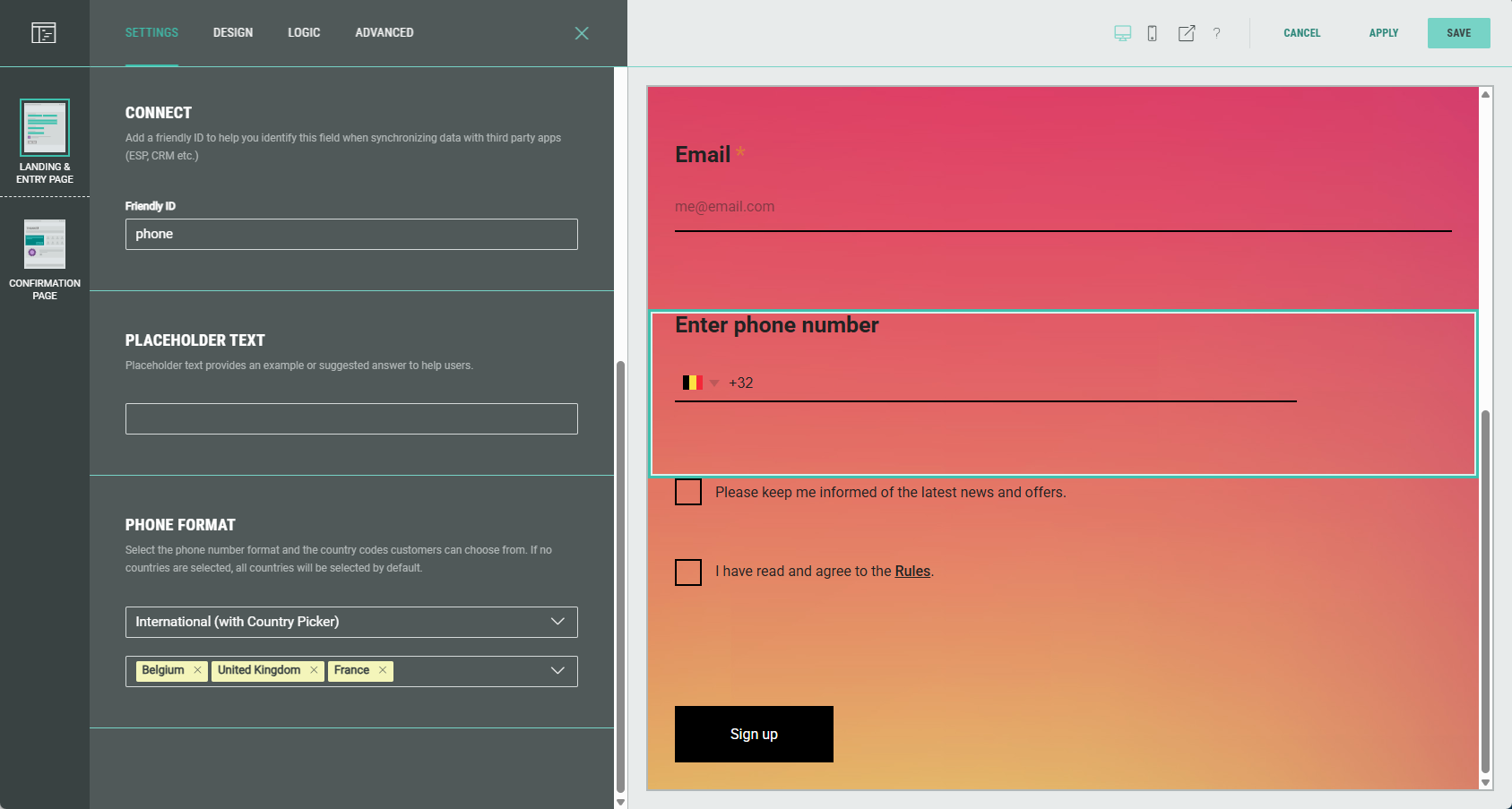 By selecting this option, you can limit the list of countries for which a phone number can be entered by the Experience participants.