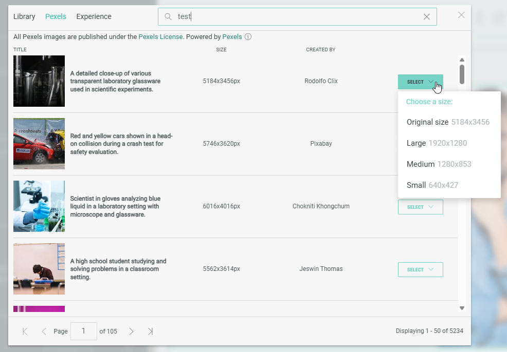 Anywhere in Grow where you can add an image (for example, while building an Experience), you have the option to select an external image from Pexels.