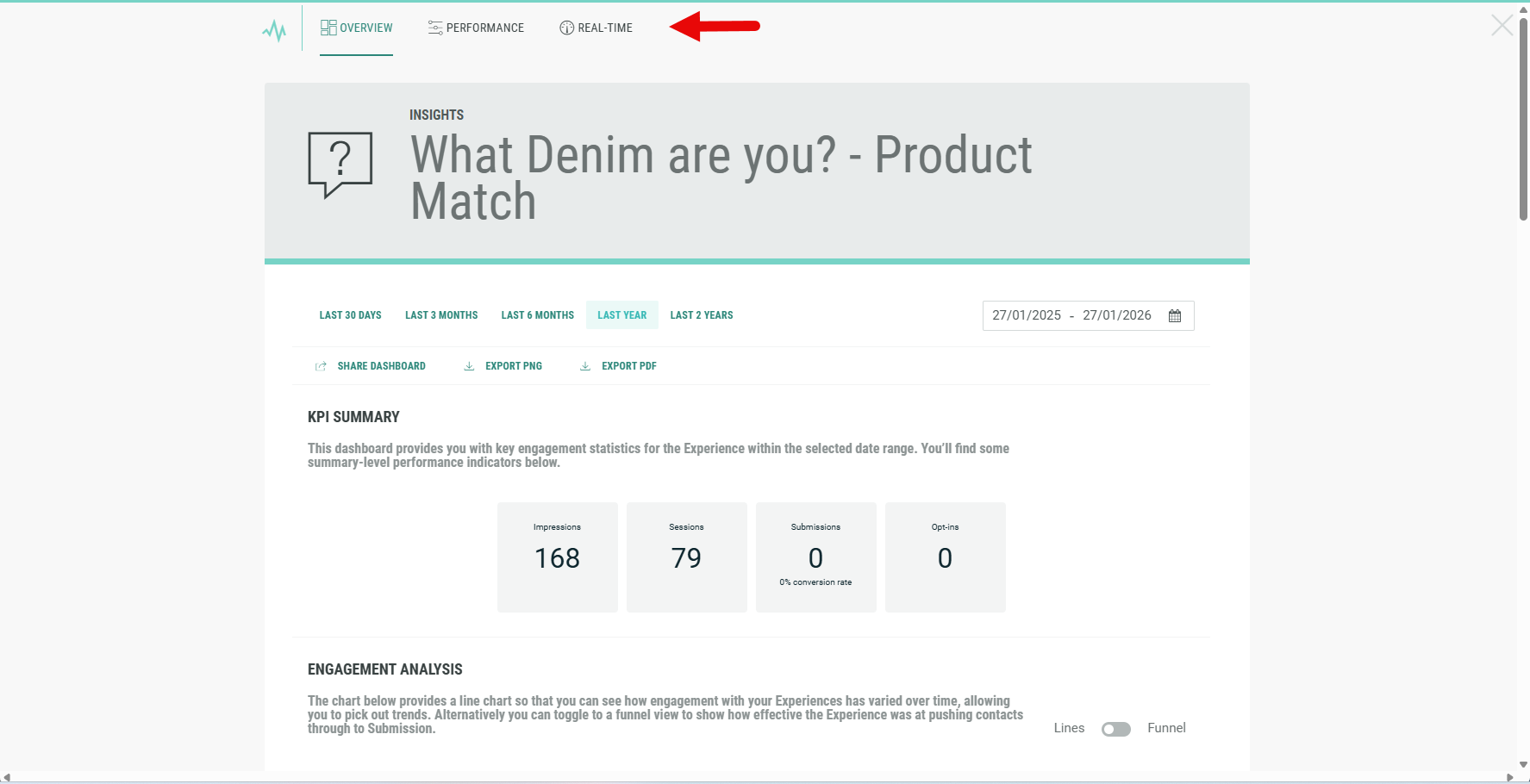 The insights are displayed, containing all Experience-level reporting tabs: Overview, Performance and Real-Time.