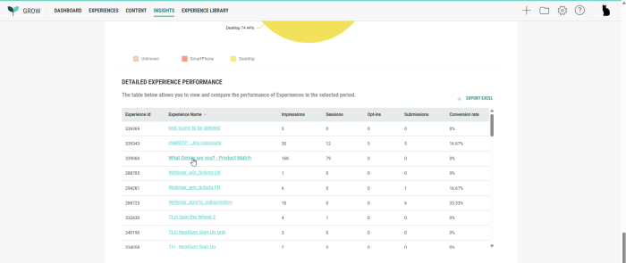Previously, when Grow users accessed the Insights tab, and clicked on an Experience name in the Detailed Experience performance table, only a limited view was shown.
