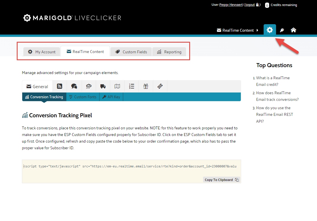 Retrieve the conversion tracking pixel, used to include in your website pages to track which Liveclicker element leads to a conversion. (required if conversion tracking is used).