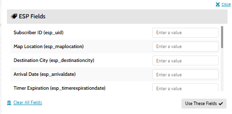 Note: Use the Populate Custom Fields link to define custom values for your custom fields and see how this renders your element in the test email . In the pop-up, fill out values for the custom fields used in your element, and click Use these fields to confirm.