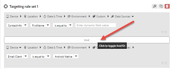 Note: You can add as many targeting rules as required. Click Add Targeting Rule Set to add additional sets of rules. When more than one targeting rule set exists, an arrow is displayed, allowing to move a targeting rules set up or down. This is important as targeting rules are executed top to bottom.![]()