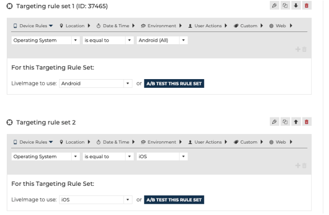 In this example, a LiveImage campaign is set up with 3 different versions: Default (Desktop), iOS, and Android. Each of these images have device specific clickthroughs. The element has the following targeting rules set up: