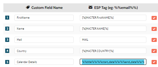 c) In the ESP Tag field, you will need to put in a variable tag for each of the listed Event fields separated by the pipe "|" symbol, respecting the following order: title|start_date|end_date|timezone|location|url|summary