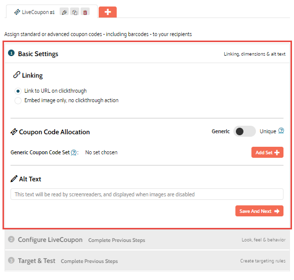 Coupon Code Allocation — Choose between a generic or a unique coupon code using the toggle on the right.
