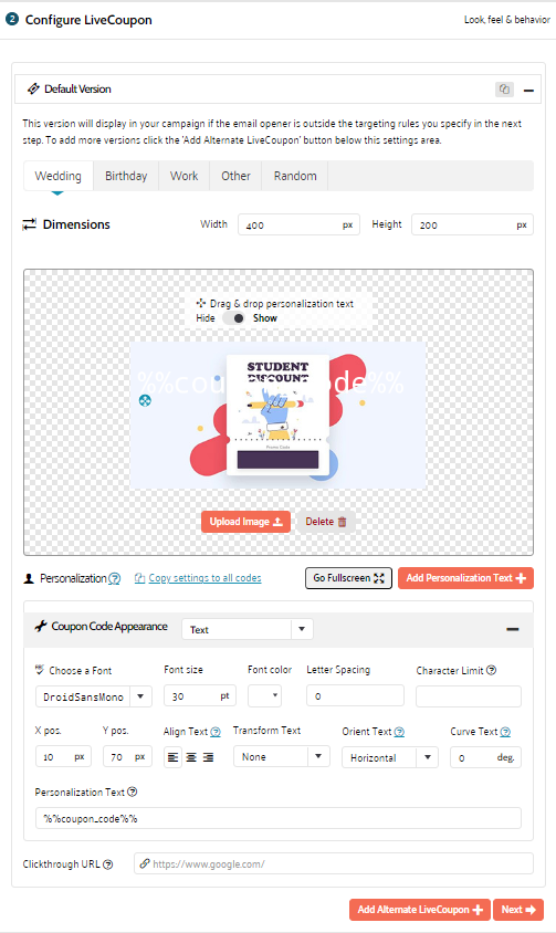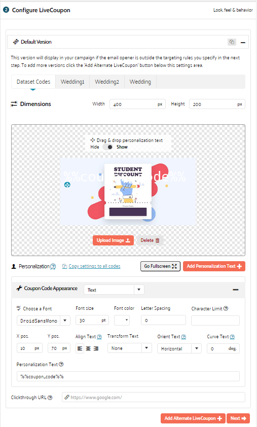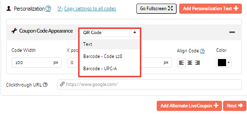 • Text — The coupon is displayed in text format. You can configure font settings, letter spacing, character limit as well as text position, orientation, alignment and curving.
