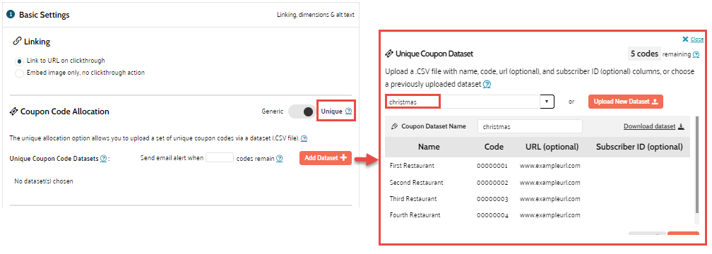 When creating a new LiveCoupon campaign, your uploaded dataset will be displayed in Step 1 when you select the unique allocation option.