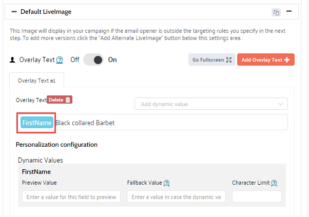 You can personalize the overlay text of your LiveImage with information either from your ESP or from data imported via CSV or API.