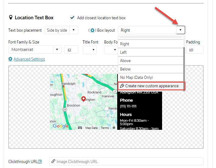 1. In the LiveMap campaign, in the Location Text Box setting, click on the Box Layout drop-down and select Create new custom appearance.