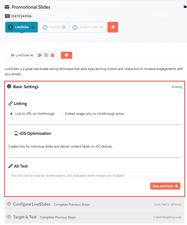 iOS optimization — Choose whether you want to use iOS Optimization on your LiveSlides. iOS Optimization allows you to add different clickthrough links for the individual slides and deliver content faster to iOS email clients.