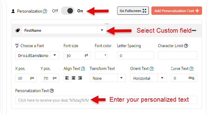 Select a Custom field from the drop-down. This field can be used to personalize the personalization text below.