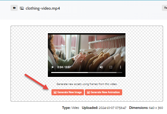 Note: In the preview of a video asset, you can generate an image or an animation from a frame in the video. Use the button Generate new image to select a specific frame in the video and save it as an image. For an animation, click the button Generate new animation and select a starting and an ending frame and then save it is an animation.