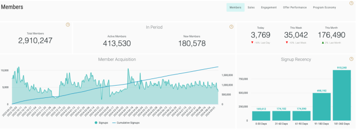 1. Legacy: The original technology embedded in Loyalty used to present analytics dashboards. You will know that you are currently using Legacy dashboards based on the layout and color scheme used by Legacy. Note that each customer may have their own version and thus appearances in layout may vary.
