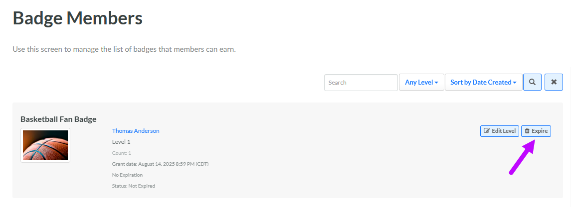 Note: You can also expire a Badge from the Members tab of the Badge Details screen. See Expire a Badge for more information on that process.