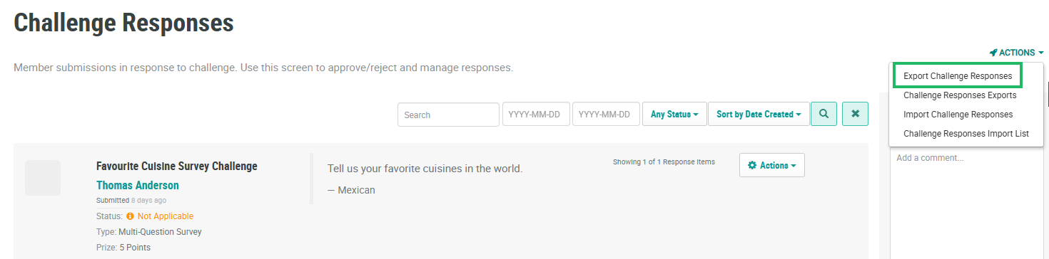 1. Select Challenges from the top navigation bar, then select Challenges > Challenge Responses from the side navigation menu. The Challenge Responses screen is displayed.