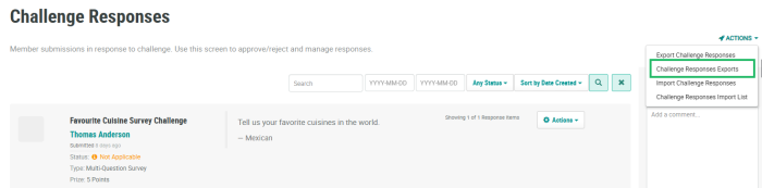 Select Challenges from the top navigation bar, then select Challenges > Challenge Responses from the side navigation menu. The Challenge Responses screen is displayed.