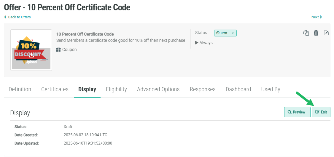 1. Navigate to the Details screen for the desired asset. For example, if you need to define the content for a specific Offer, you would navigate to the Offers screen, then search for and select the desired Offer to view the Offer Details screen.