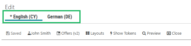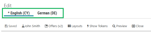 If you have localization enabled, and you have defined more than one locale, the Content Editor displays a series of tabs across the top of the screen, with each tab representing a specific locale. To enter localized content, simply select the tab for the desired locale, then enter your content.