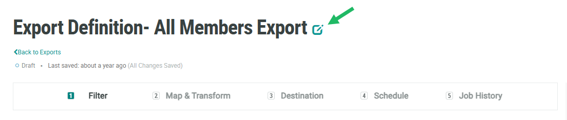 4. Near the top of the screen, click the Edit icon next to the Export Definition name. The Edit Export Definition Name pop-up window is displayed.