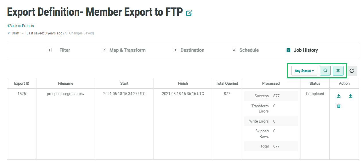 The platform maintains a log of every Export Definition job execution. To view the job history for an Export Definition: