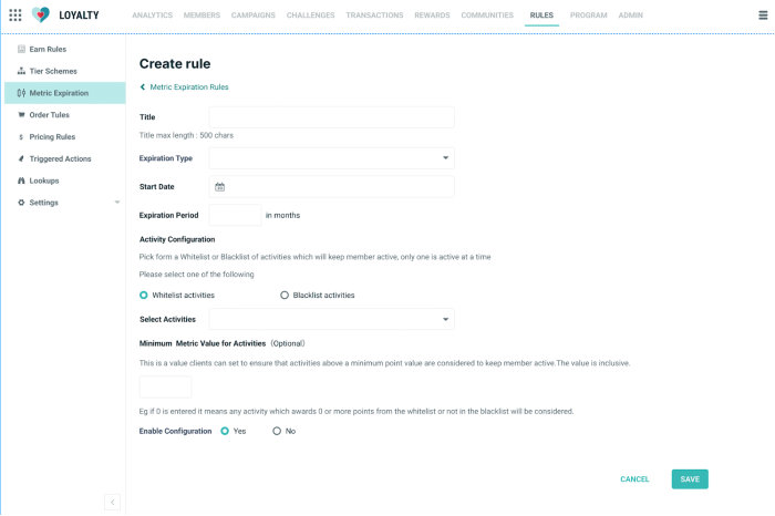 - Click Create Rule. This takes you to the Detail page for configuring the Last Activity Expiration.Note: This rule will currently apply to all metrics, which are marked as expire-able. Currently Loyalty does not support different rules across different metrics.