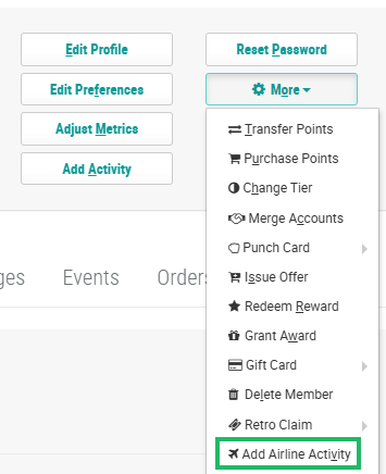 For clients in the airline industry, the Member Profile screen allows Customer Service Representatives to manually add a new Flight Activity for a Member. When added manually in this manner, the Flight information is validated and enters into an approval workflow where it must be reviewed and approved on the Flights Approval screen. Once the Flight information is approved, the platform creates the Flight Activity record associated with the selected Member.