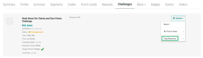 4. Next to the desired Challenge Response, from the Action drop-down menu, select Flag a Response, then select a reason, such as "Inappropriate."