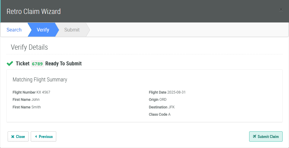 2. Click Verify. The platform attempts to validate the claim based on the First Name / Last Name associated with the Flight.