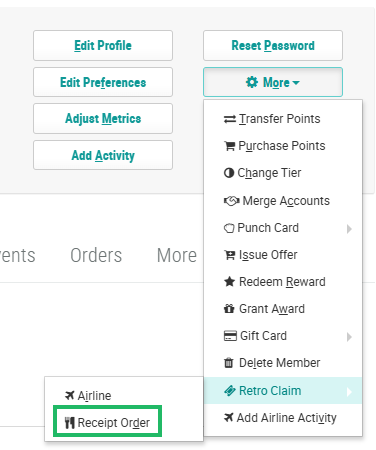 For clients in the restaurant or retail industries, the Member Profile screen allows Customer Service Representatives to retroactively associate an anonymous Order with a Member. This process is referred to as a "retro claim," and allows the Member to correctly receive any Metrics that they should have earned from that Order.