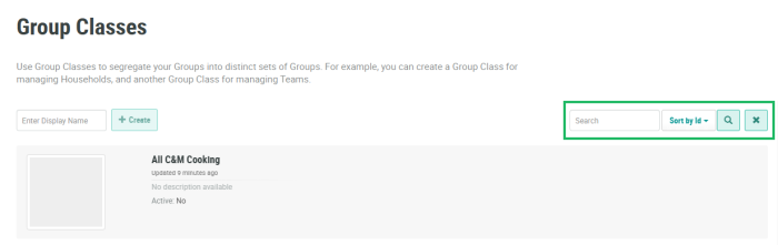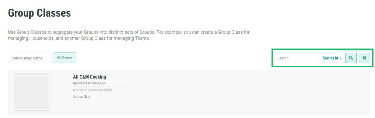 The search feature on the Group Classes screen allows you to search for a specified text string anywhere within the Display Name and Internal Name. Optionally, in the Search field, enter the desired text string. Click the Search icon. The screen is refreshed to show only the Group Classes that meet your search criteria.