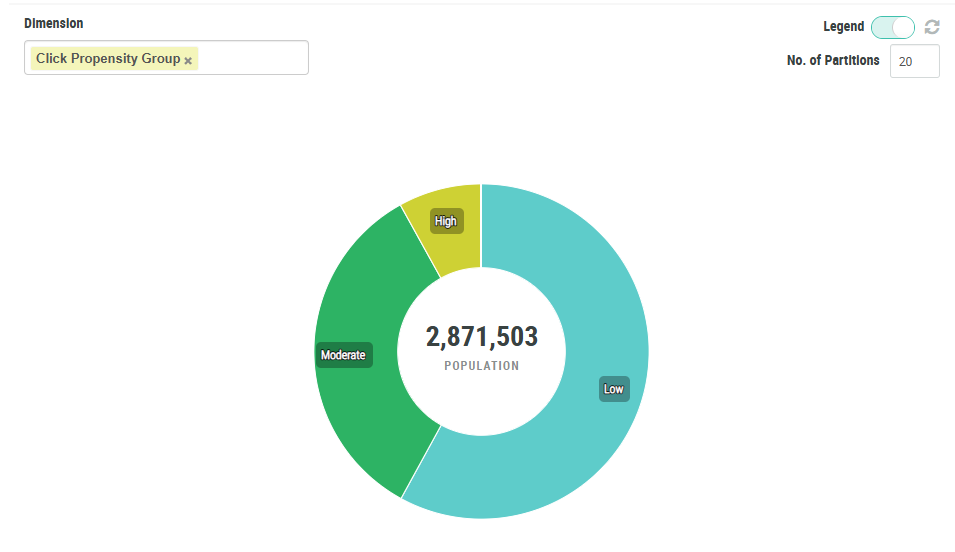 For example, let's say you want to view a breakdown of your Member population based on their propensity to click a link in an email message. You would begin by selecting the Click Propensity Group Member Attribute as the dimension. The platform generates a donut chart showing the relatives sizes of the Low, Moderate, and High Click Propensity Groups.