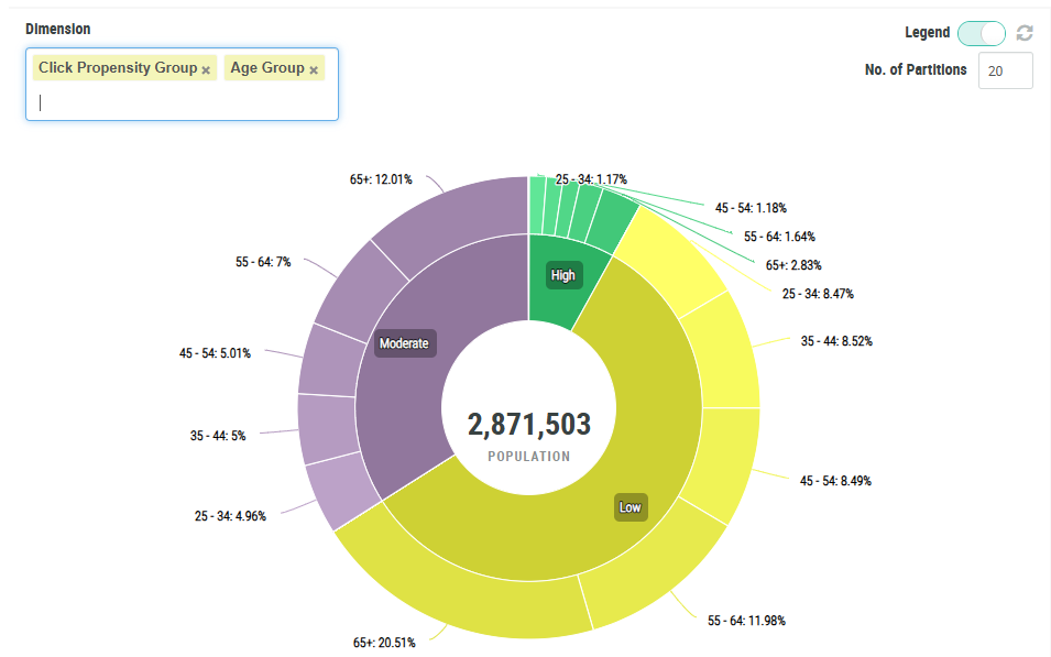 Continuing the above example, let's say you want to further explore your Member data by showing Member ages for each Click Propensity Group. You would add a second dimension: the Age Group Member Function. This Function assigns Members to one of a handful of age groups. The platform adds a second ring to the donut chart, showing how the Age Group breaks down for each Click Propensity Group.