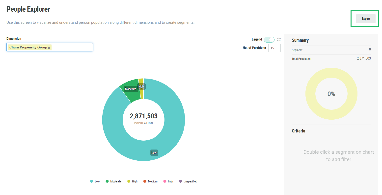 The People Explorer screen allows you to visualize and understand your Member population along one or two dimensions. When you select a dimension, the platform generates a donut chart. You can export this chart into a .png file for use in another platform or system.