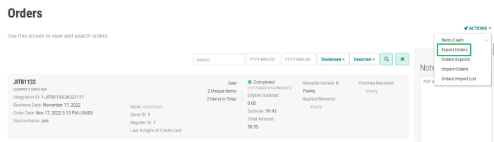 From the Actions drop-down menu, select Export Orders. The Create New Export pop-up window is displayed.