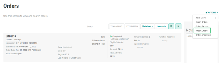 Orders can be created automatically by the Loyalty platform based on information provided from a Point of Sale system. In addition, you can import a file of Orders.