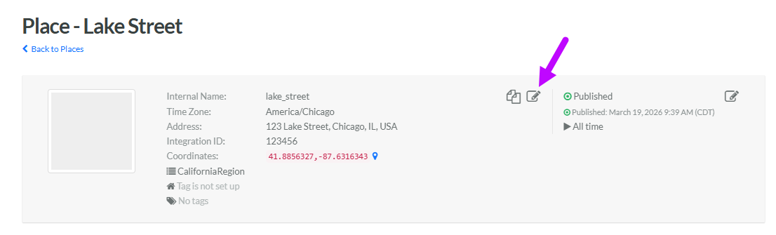 3. Within the header area, click the Edit icon. The Edit Place pop-up window is displayed.