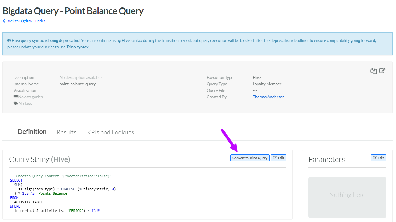 Note: The Convert to Trino Query button is displayed only if Hive is the currently selected Execution Type. If you need to change the selected Execution Type, click Edit, select Hive from the Execution Type drop-down menu, then click Save.