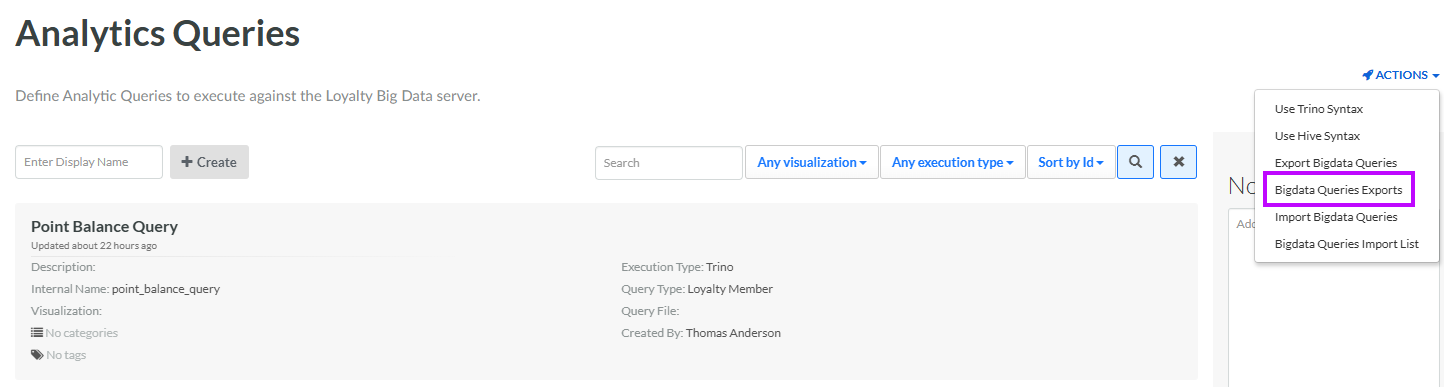 From the Actions drop-down menu, select Bigdata Queries Exports. The Bigdata Queries Export Definitions pop-up window is displayed and populated with a list of all existing Query exports.